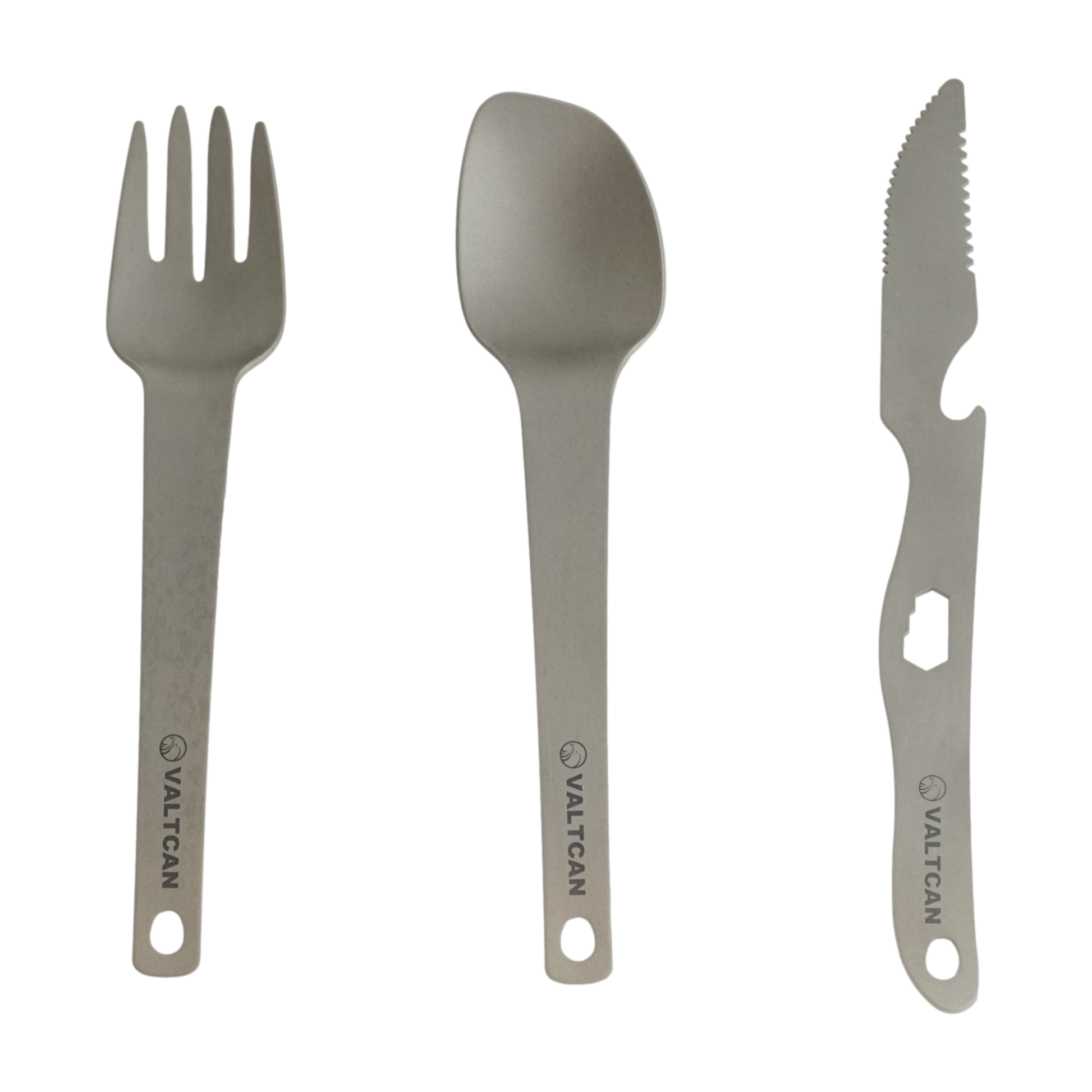 Valtcan titanium 3 Piece thick utensil set for home and outdoors with total Weight: 63 grams or 2.2 oz. Utensils are made entirely of Titanium. Weight of fork 20g or 0.7oz, spoon 25g or 0.9 oz, and knife 17g or 0.6 oz. Dimensions Length: Fork and spoon - 6.6 x 1.5 inches and knife - 7.3 x 0.75 inches. Valtcan Eagle logo on middle of utensils. Durable, diswasher safe, lightweight, strong, tough, and just works. Feels good on mouth and tongue.